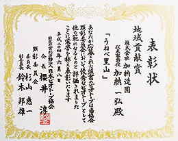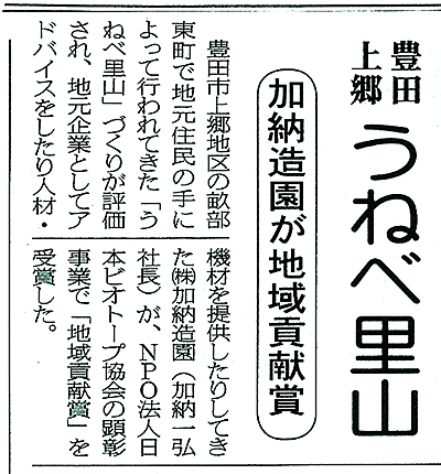 平成19年度より上郷地域・環境ボランティアグループ「緑野の会」と共に上郷地域に残る貴重な雑木林「うねべ里山」(柳川瀬公園東地区)を整備・保全してきました。平成24年6月8日、日本ビオトープ協会より岩手県盛岡市で開催された「ビオトープフォーラムin盛岡2012」大会で里山づくりへのアドバイス・人材提供等社会貢献活動が評価され「地域貢献賞」を受賞いたしました。今後とも企業で出来る地域への奉仕活動を継続して参りたいと思います。