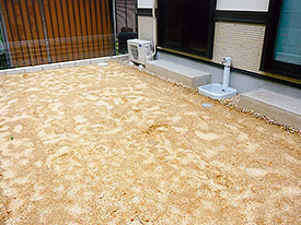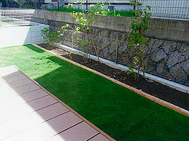 防草シート上に人工芝を施工。素足でも小さな子供も安心して遊ばせることができる庭に。