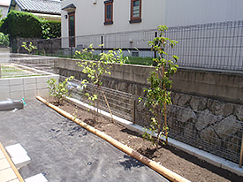 庭の除草などメンテナンスの楽な庭づくりの要望から庭部分に防草シート・人工芝・ウッドデッキを設置。フェンス沿には花・野菜などが植えられる花壇を設置。